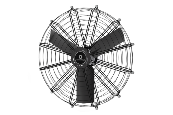 Ventilatore assiale ad alte portate adatto per installazione sospesa a soffitto/trave con reti di protezione, per creare un clima interno uniforme e ricircolare l’aria in edifici commerciali e industriali, allevamenti, stalle e serre.